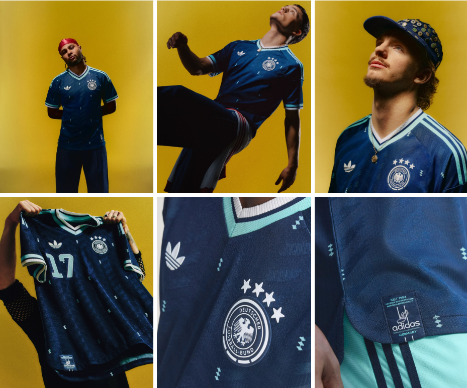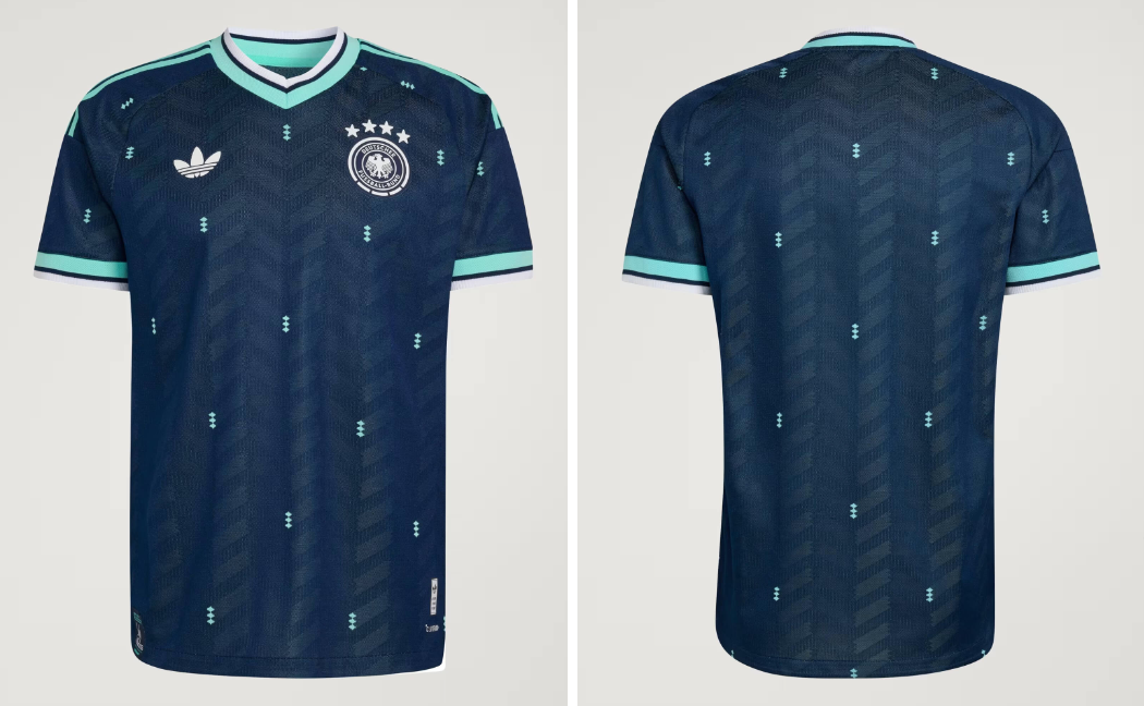A nova camisa reserva da Alemanha traz a cor azul-marinho como base e um grafismo em jacquard reinterpretando os tradicionais chevrons diagonais em padrão contínuo por toda a peça, formando um efeito dinâmico com três formas interligadas. Essa combinação inédita de cores passeia por diferentes momentos da seleção, evocando desde os detalhes azuis na camisa de 1954, até uniformes de treino de anos posteriores. Já o turquesa lembra os vibrantes anos 90