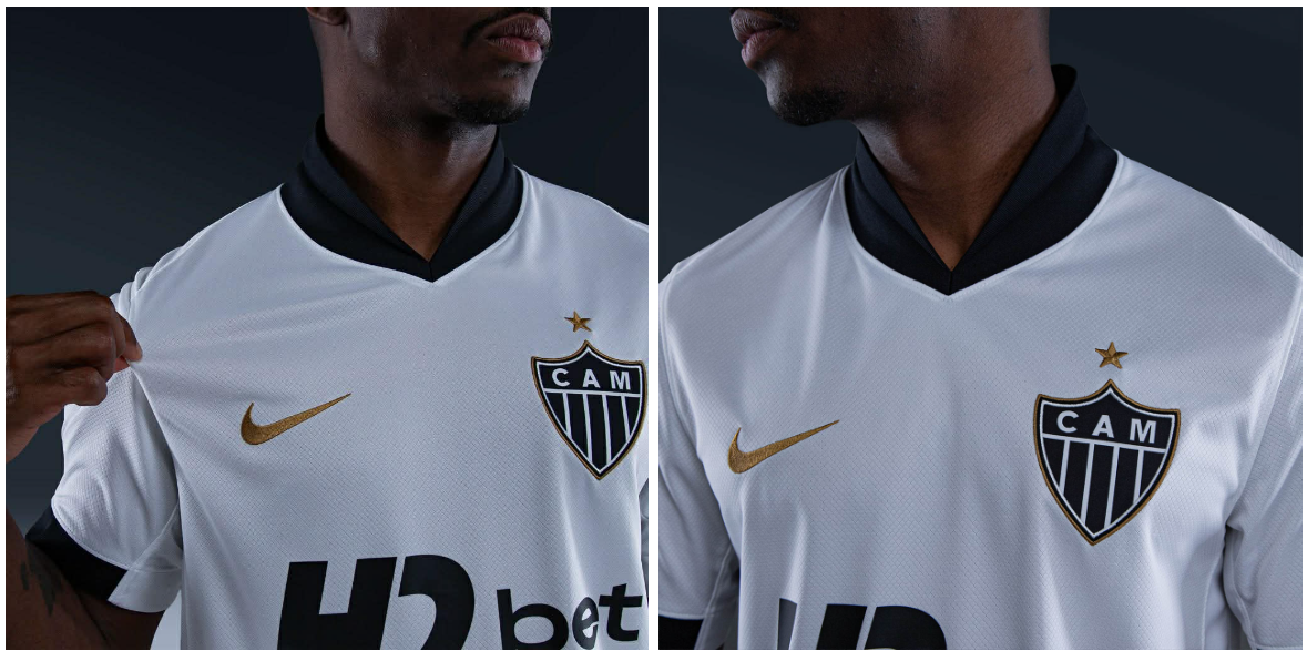 O escudo do Atlético é aplicado no lado esquerdo do peito, enquanto o logo da Nike aparece no lado direito em dourado. O patrocínio máster da H2Bet é aplicado em preto. Dentro da gola, a frase “Galo Doido” é vista
