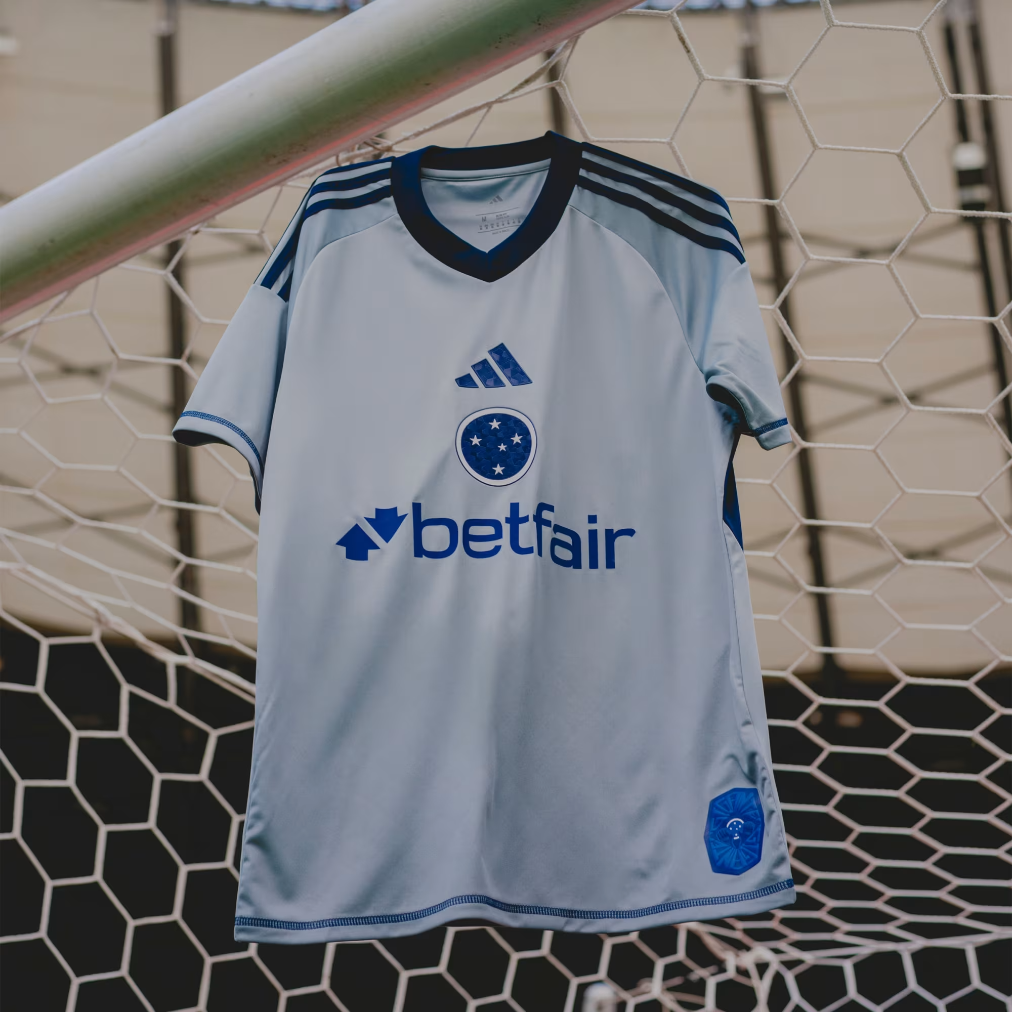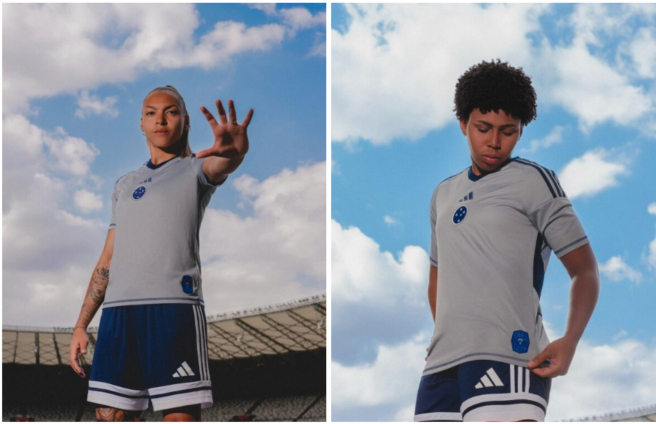Com estética marcante, a peça ainda traz detalhes em azul marinho e o patch da “Camisa de Gigantes”, destacando a identidade do lançamento. A gola tem formato V azul marinho, mesma cor de detalhes nas laterais do corpo e das três listras nas mangas.