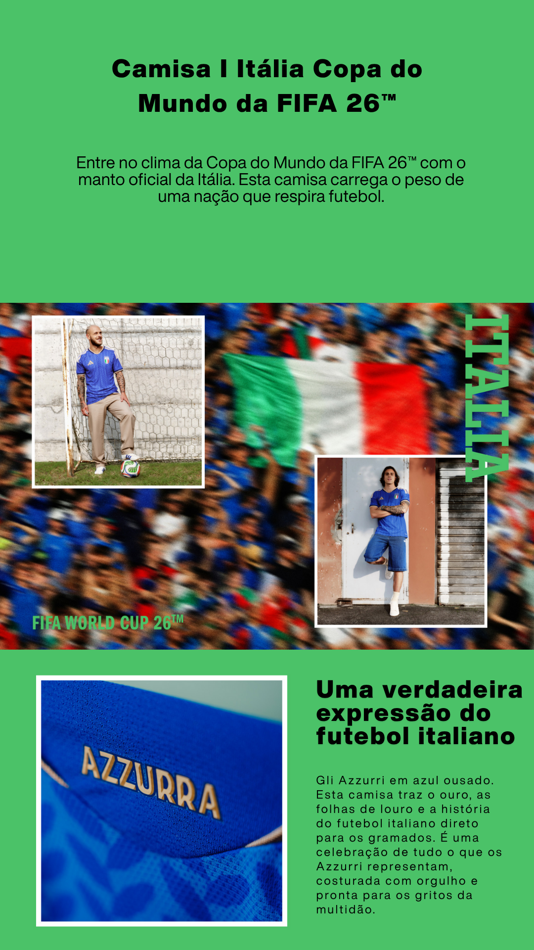 A nova camisa titular da Itália é inspirada na rica herança do futebol italiano e celebra a essência da FIGC (Federação Italiana de Futebol) com seu design arrojado. Ela é predominantemente azul e tem um gráfico formado por ramos de folhas em tom sobre tom.